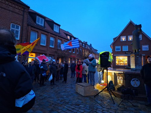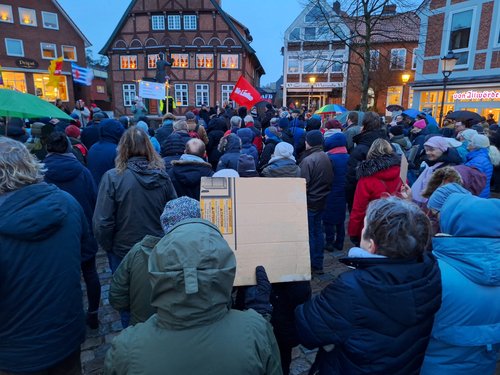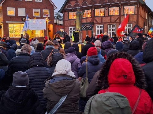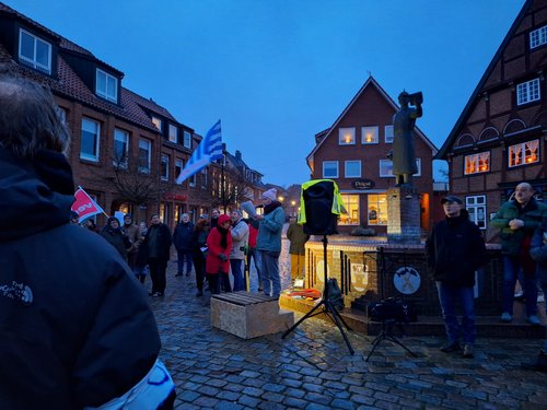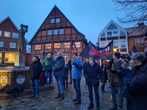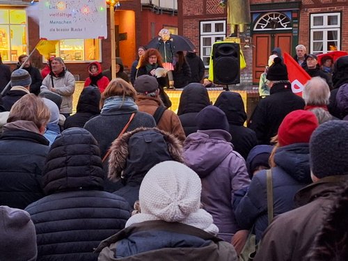 Laut Polizei hatten wir 300 TeilnehmerInnen. Unsere Redner haben viele wichtige Aspekte zur Sprache gebracht. Bernd Friedrich hat an die Geschichte erinnert. Dirk Baumann hat seine persönliche Sicht beigesteuert. Frank Hornschu hat als Gewerkschafter gesprochen. Jan Kürschner hat als Innen- und rechtspolitische Sprecher der Grünen auf die Verfassung verwiesen. Pastor Harms hat mit uns aus christlicher Sicht auf die Ereignisse geschaut.