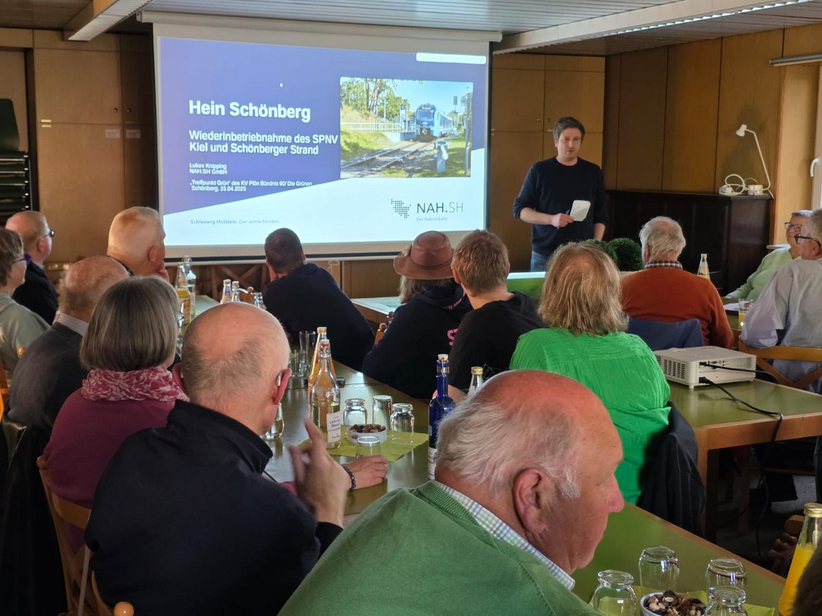 Fast 50 Interessierte fanden sich am 25. April 2025 im Sprüttenhus in Schönberg ein, um sich über die Wiederinbetriebnahme der Bahnstrecke Kiel–Schönberger Strand zu informieren. Eingeladen zu der Veranstaltung hatte der Ortsverband Schönberg - Probstei-Ost.