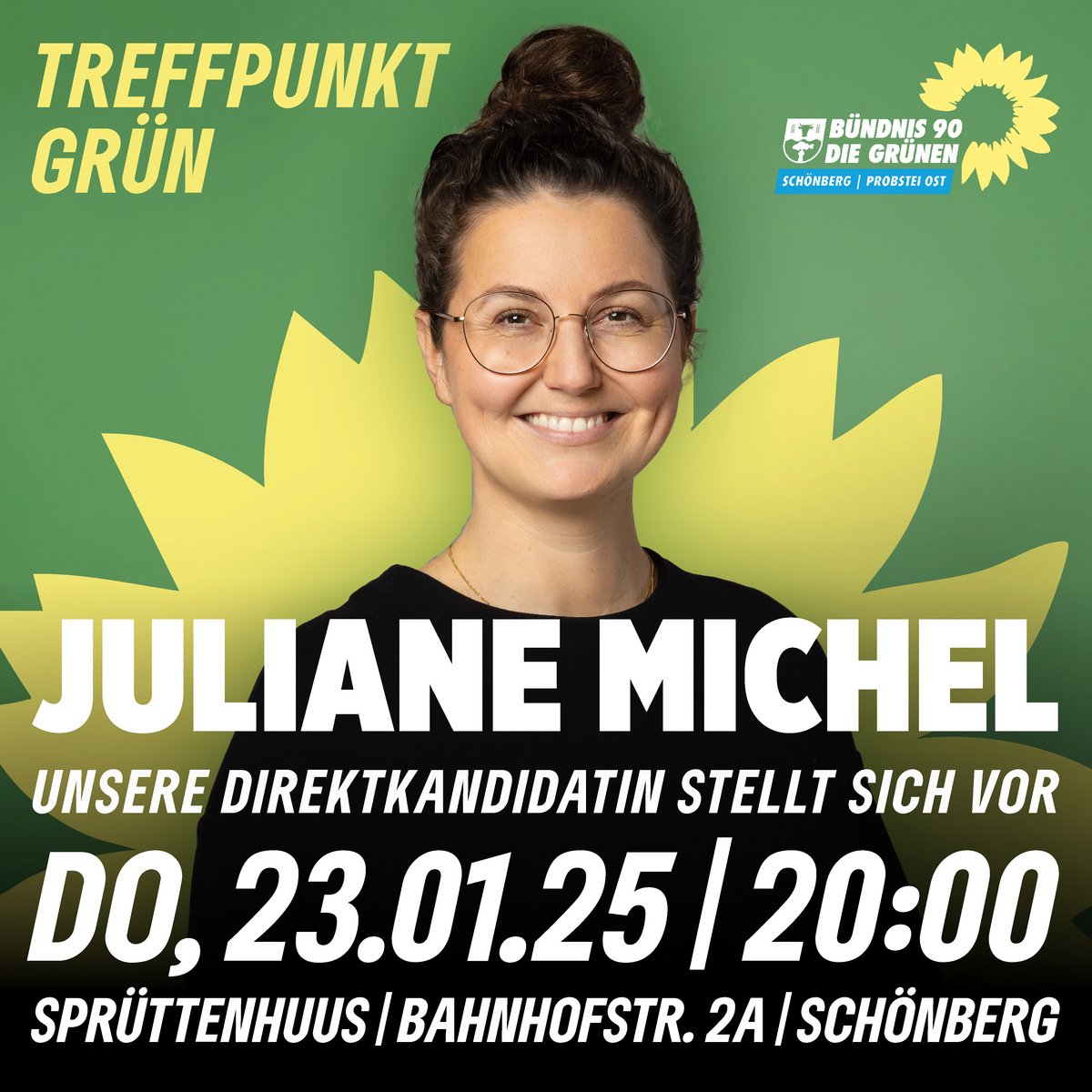 Am Donnerstag, den 23. Januar um 20 Uhr war es soweit: Juliane Michel-Weichenthal (Vorsitzende KV Neumünster), Direktkandidatin der Grünen für den Wahlkreis 006 Plön – Neumünster im Bundestagswahlkampf 2025, stellte sich im Schönberger Sprüttenhus etwa 30 interessierten Bürgerinnen und Bürgern vor.