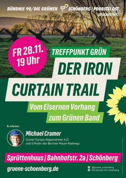 Der Ortsverband und die Fraktion von Bündnis 90/Die Grünen laden herzlich ein zu einem besonderen Abend: Am Freitag, 28. November 2025, um 19:00 Uhr im Sprüttenhuus Schönberg erzählt Michael Cramer, Grüner Politiker und Verkehrsexperte, von der spannenden Geschichte des Iron Curtain Trail.